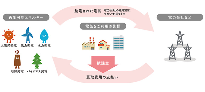 再生可能エネルギーで発電した電気を、電力会社が一定価格で一定期間買い取ることを国が約束する制度です。